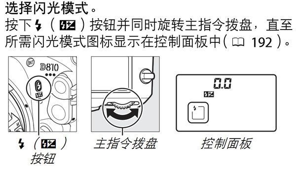 按住闪光按钮使用主指令拨盘来选择相机的闪光模式,如图: